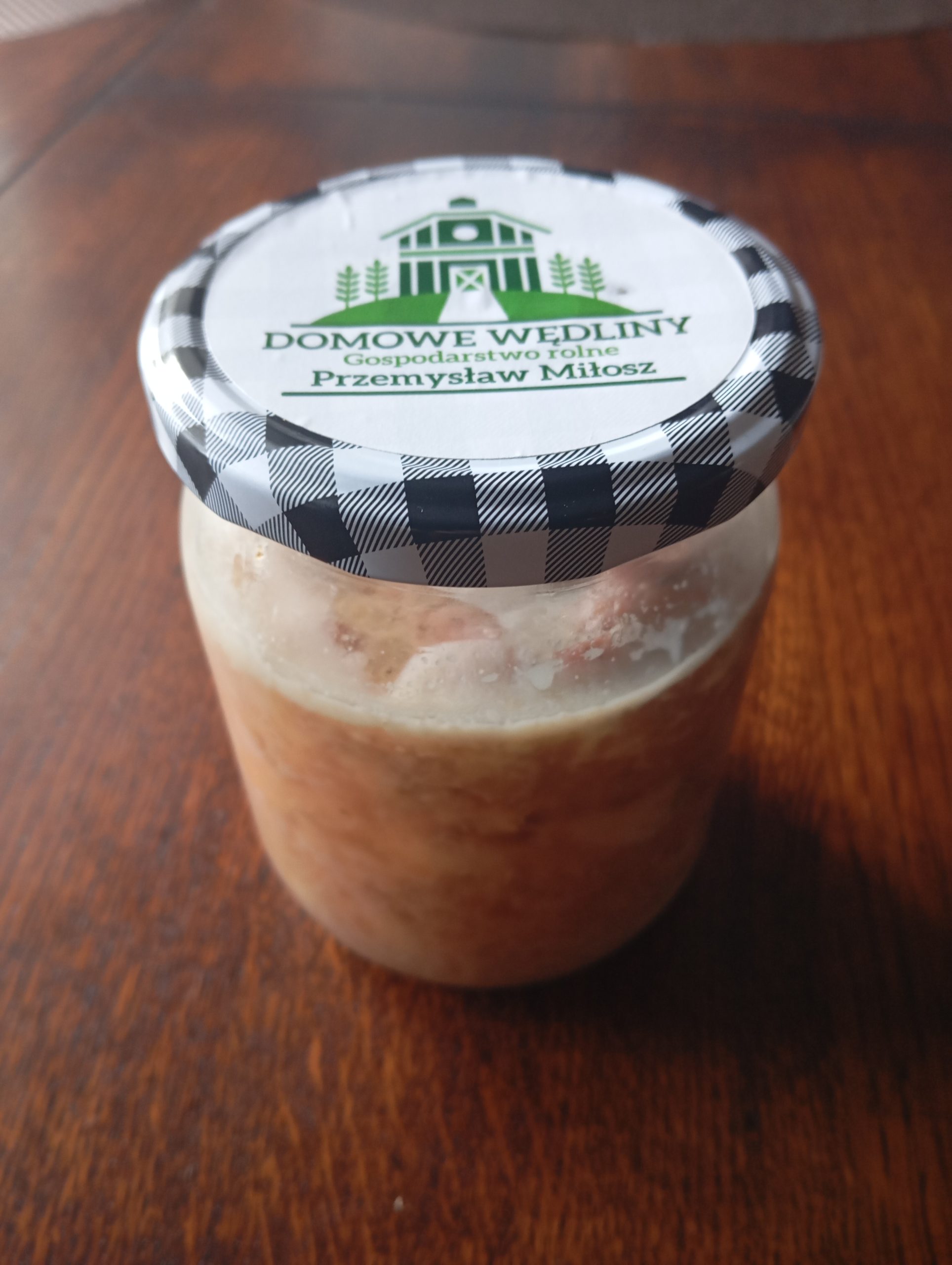 Skład: świeże mięso wieprzowe, sól, pieprz, gałka muszkatołowa mielona, kolendra, papryka, majeranek, jałowiec, gorczyca, kminek . Wyraziście przyprawione delikatne mięso . Bardzo kruche w temperaturze pokojowej łatwe do rozsmarowania na świeżym i pachnącym chlebie.
